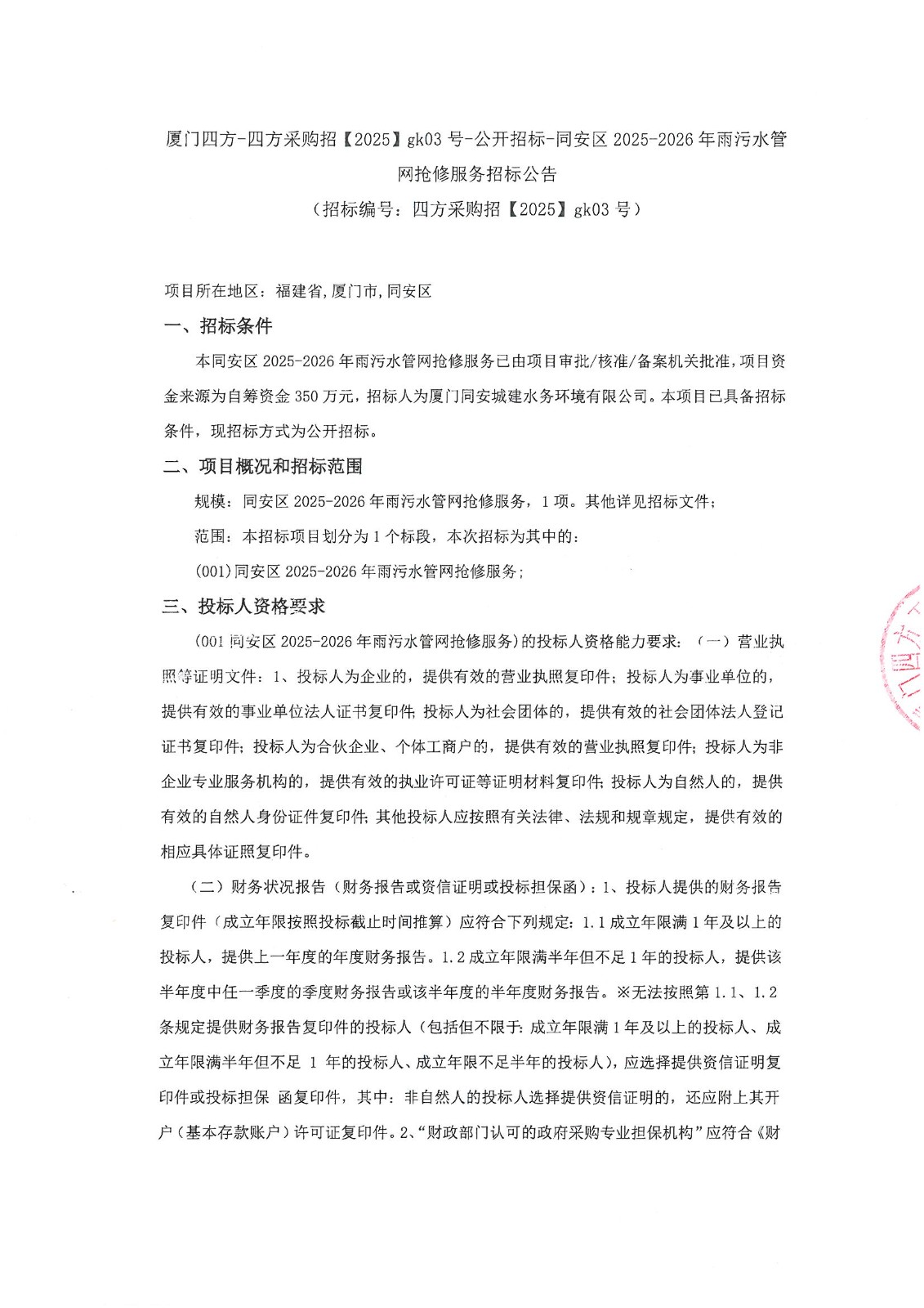 厦门四方-四方采购招【2025】gk03号-公开招标-同安区2025-2026年雨污水管网抢修服务招标公告