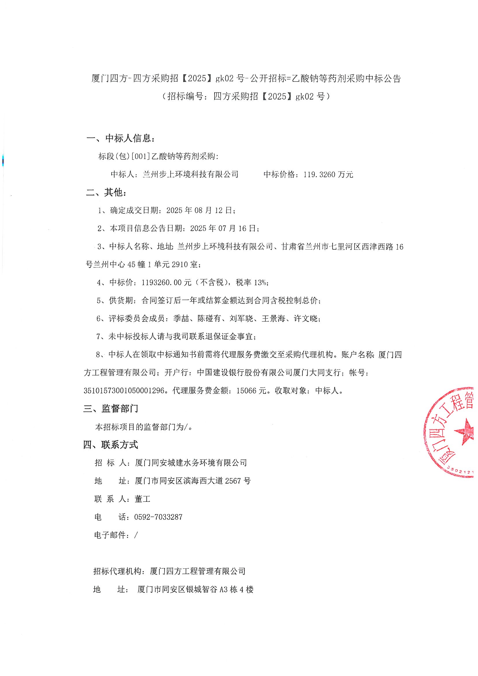 厦门四方-四方采购招【2025】gk02号-公开招标=乙酸钠等药剂采购中标公告
